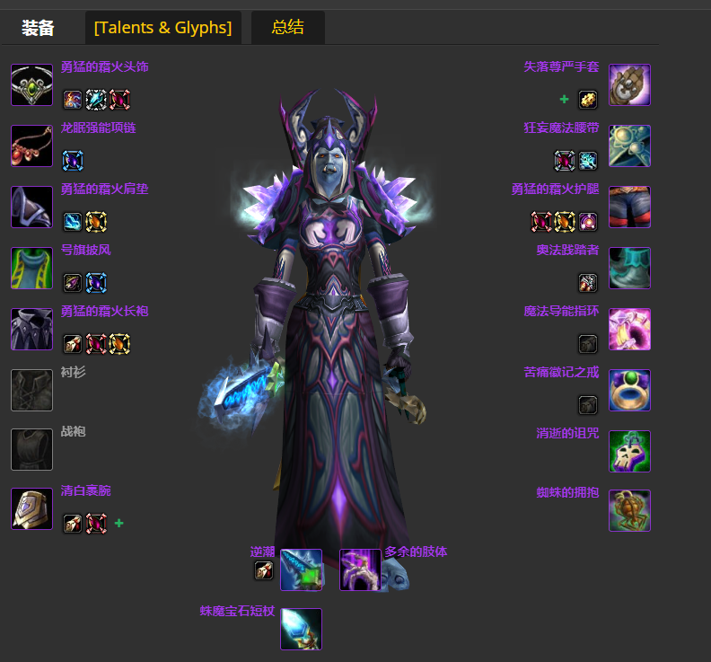 魔兽世界奥术法师都带什么装备才算毕业?武器日久加深渊(奥法急速很重要)G杖是扯淡,精神对法师基本没用,奥法的泻蓝很快,至于现在有人传说精神对法师的法伤有加成,害我先跑去消费一根,带上一点都没加,狗杖虽是极品,但是毕业算不上) 项链自由魔法为毕业,透明法伤高,但是相对急速不够,3点法伤和10+几速你选什么?